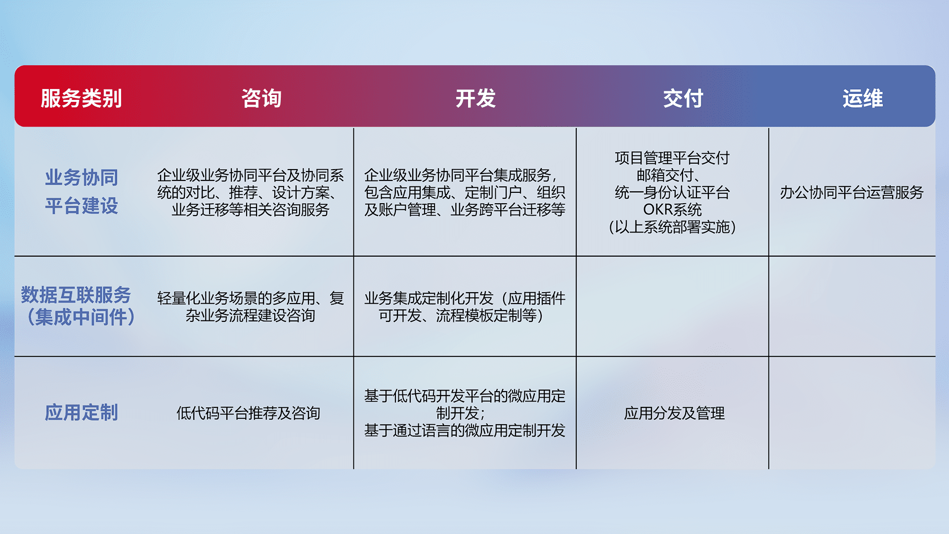 针对钉钉、、、企微、、、、IDaas等平台级产品提供产品的规划、、、方案、、、、交付、、定制化开发等服务,,,,实现如统一协同办公、、、、智能客户服务、、、、混合会议管理、、智能数据查询、、、、等业务场景,,,实现数字化转型。。。。