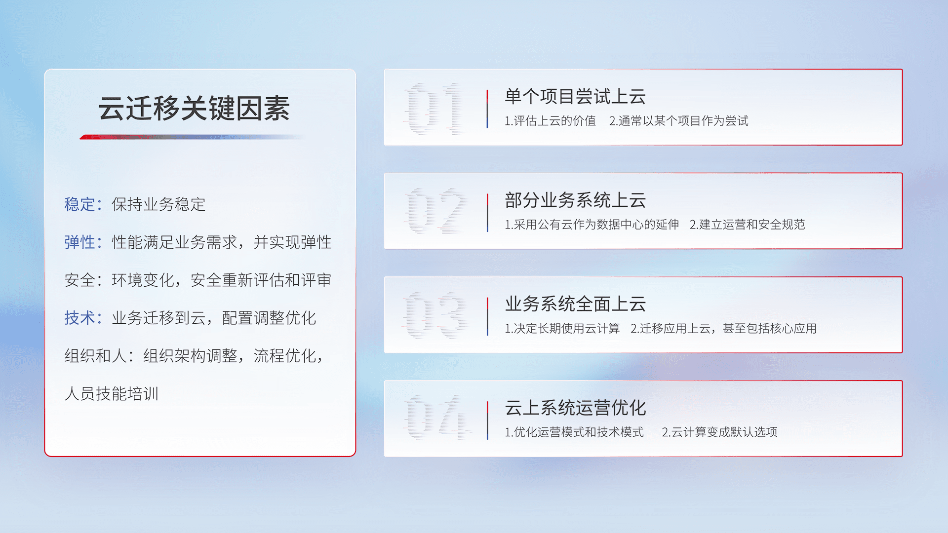 结合实际业务,,,,从规划设计、、、、云平台选型、、、、云原生改造、、数据迁移、、集成交付,,迁移全过程为客户识别最佳上云路径,,,做好风险识别管理,,,设计网络架构、、身份权限、、、安全审计合规、、、操作审计、、、日志审计、、、监控告警策略、、、、多站点容灾设计等,,对云上基础设施进行整体规划,,,,提升IT治理水平,,以满足弹性、、、高可用、、高性能的需求。。