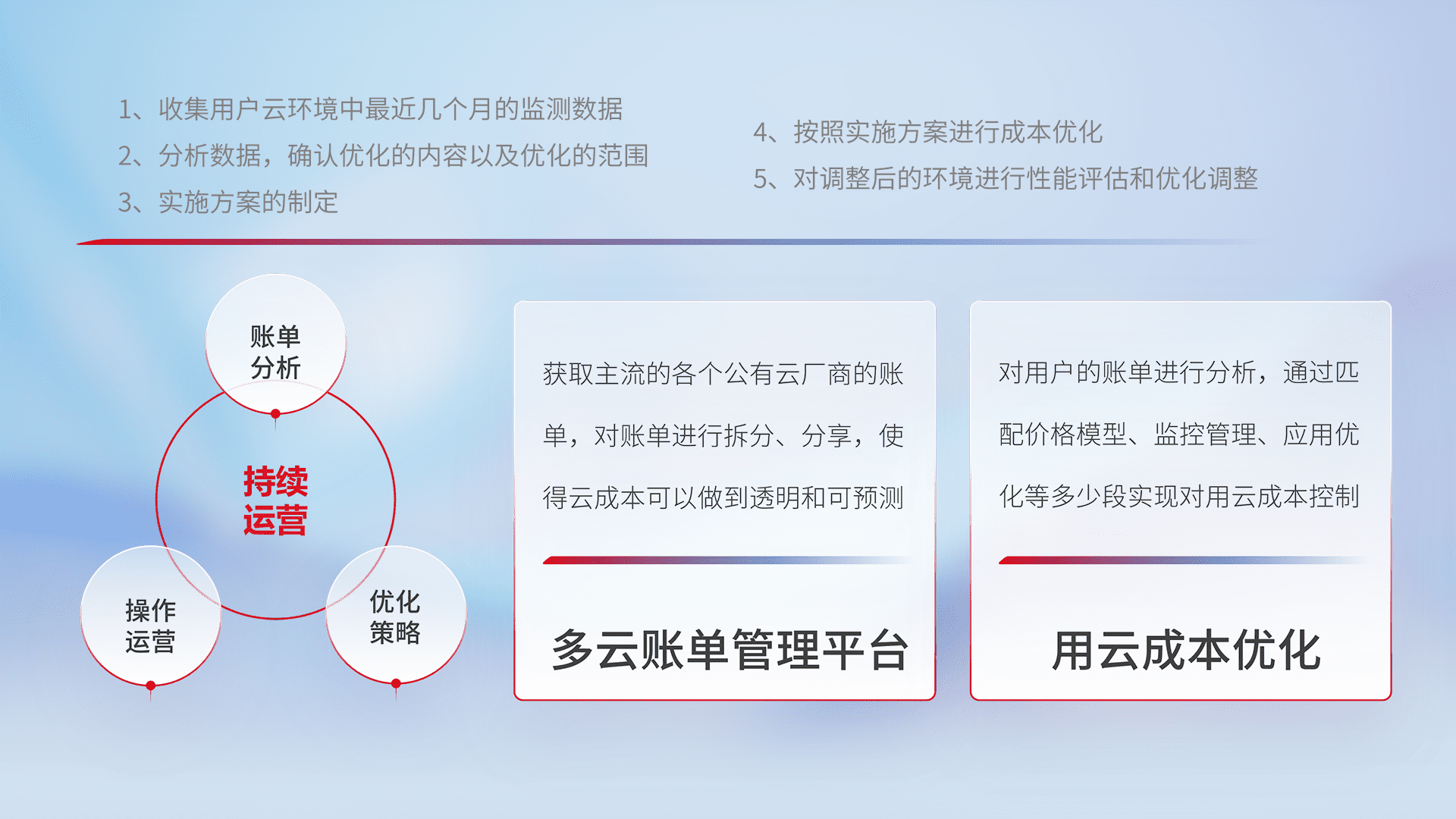 通过多云纳管,,以统一的资源数据模型把客户的云资源进行抽象和封装,,,进而实现对多云资源的统一操作,,保障云资源管理的可靠性、、、稳定性与可用性。。量身定制化运维内容,,,,配置、、、、开发运维、、、、补丁管理、、、备份、、监控、、、、认证和访问管理、、、、审计和日常巡检等,,,保障在用云过程中的可靠度,,,,稳定度以及高可用率。。。。