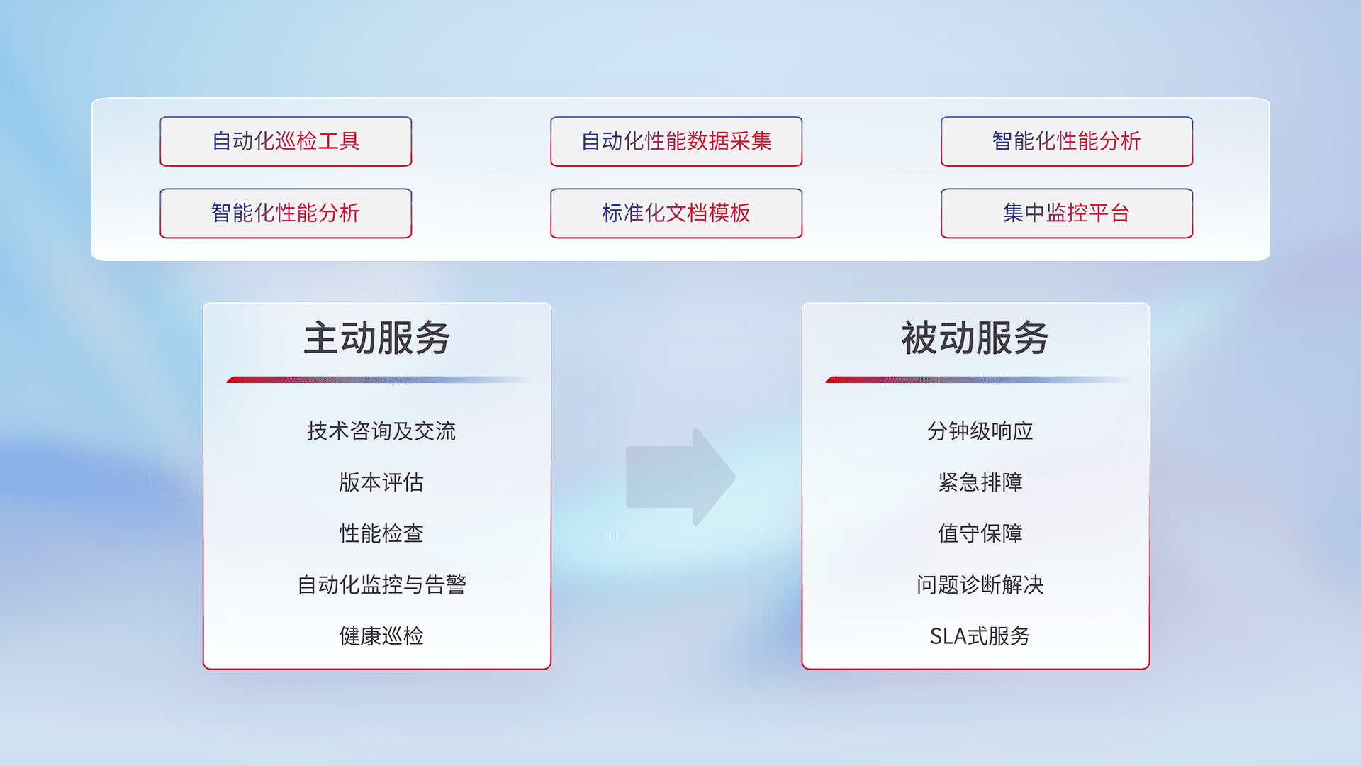 智能化工具和标准化文档,,保障服务质量,,提供主动服务(包含技术咨询、、版本评估、、、、性能检查、、、、自动化监控与告警、、、健康巡检)和被动服务包含(分钟级响应、、、、紧急排障、、、值守保障、、、问题诊断解决、、、、SLA服务)。。。。